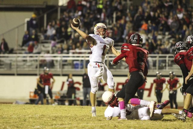 Hoisington Cardinal Tyler Specht (#1) throws a pass as Ellsworth Bearcat Colton Hower (#8) pressures him. The Hoisington Cardinals defeated the Ellsworth Bearcats 39 to 20 at Shanelac Field in Ellsworth, Kansas on October 14, 2016. (Photo: Joey Bahr, www.joeybahr.com)undefined