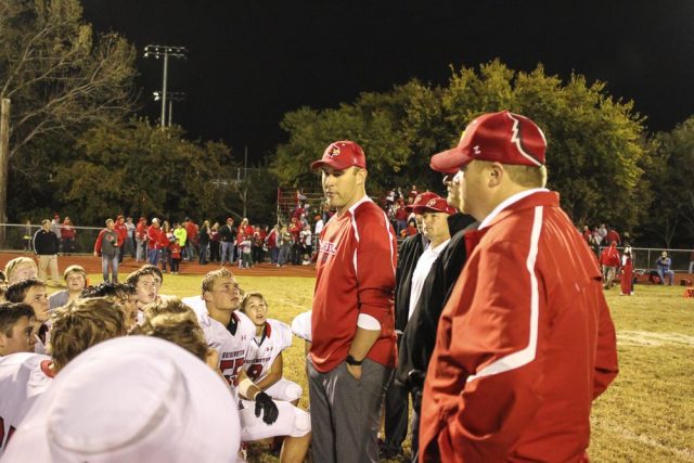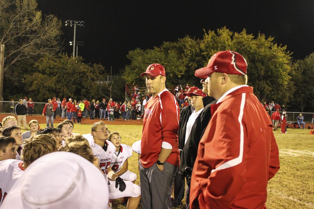 Hoisington Cardinal Head Coach Zach Baird addresses his players after the game. The Hoisington Cardinals defeated the Ellsworth Bearcats 39 to 20 at Shanelac Field in Ellsworth, Kansas on October 14, 2016. (Photo: Joey Bahr, www.joeybahr.com)undefined
