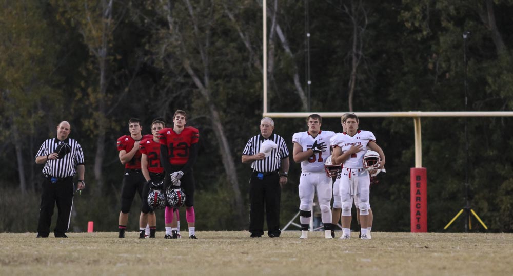 Team Captains and Referees stand at attention for the National Anthem. The Hoisington Cardinals defeated the Ellsworth Bearcats 39 to 20 at Shanelac Field in Ellsworth, Kansas on October 14, 2016. (Photo: Joey Bahr, www.joeybahr.com)undefined