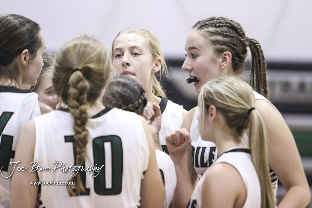 The Central Plains Lady Oilers huddle up prior to the start of the game. The Central Plains Lady Oilers defeated Hoisington Lady Cardinals by a score of 88 to 23 in a basketball game held at Central Plains High School in Claflin, Kansas on December 1, 2017. (Photo: Joey Bahr, www.joeybahr.com)undefined