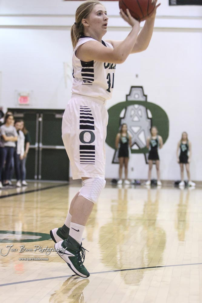 Central Plains Lady Oiler #34 Rebecca Stratmann shoots a jump shot. The Central Plains Lady Oilers defeated Hoisington Lady Cardinals by a score of 88 to 23 in a basketball game held at Central Plains High School in Claflin, Kansas on December 1, 2017. (Photo: Joey Bahr, www.joeybahr.com)undefined