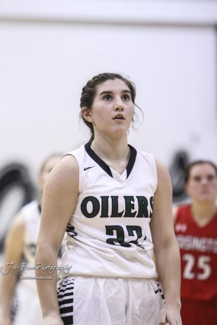 Central Plains Lady Oiler #22 Avery Hurley watches a free throw attempt hit the rim. The Central Plains Lady Oilers defeated Hoisington Lady Cardinals by a score of 88 to 23 in a basketball game held at Central Plains High School in Claflin, Kansas on December 1, 2017. (Photo: Joey Bahr, www.joeybahr.com)undefined