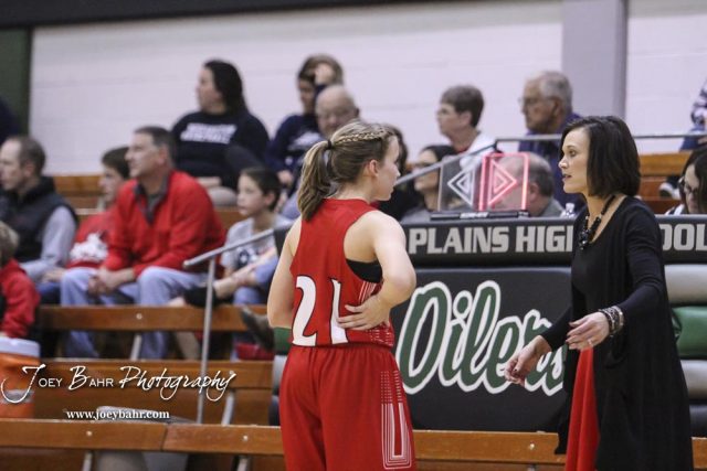 Hoisington Lady Cardinal #21 Suzanna Schneider talks to Head Coach Mandy Mason during a stop in the action. The Central Plains Lady Oilers defeated Hoisington Lady Cardinals by a score of 88 to 23 in a basketball game held at Central Plains High School in Claflin, Kansas on December 1, 2017. (Photo: Joey Bahr, www.joeybahr.com)undefined