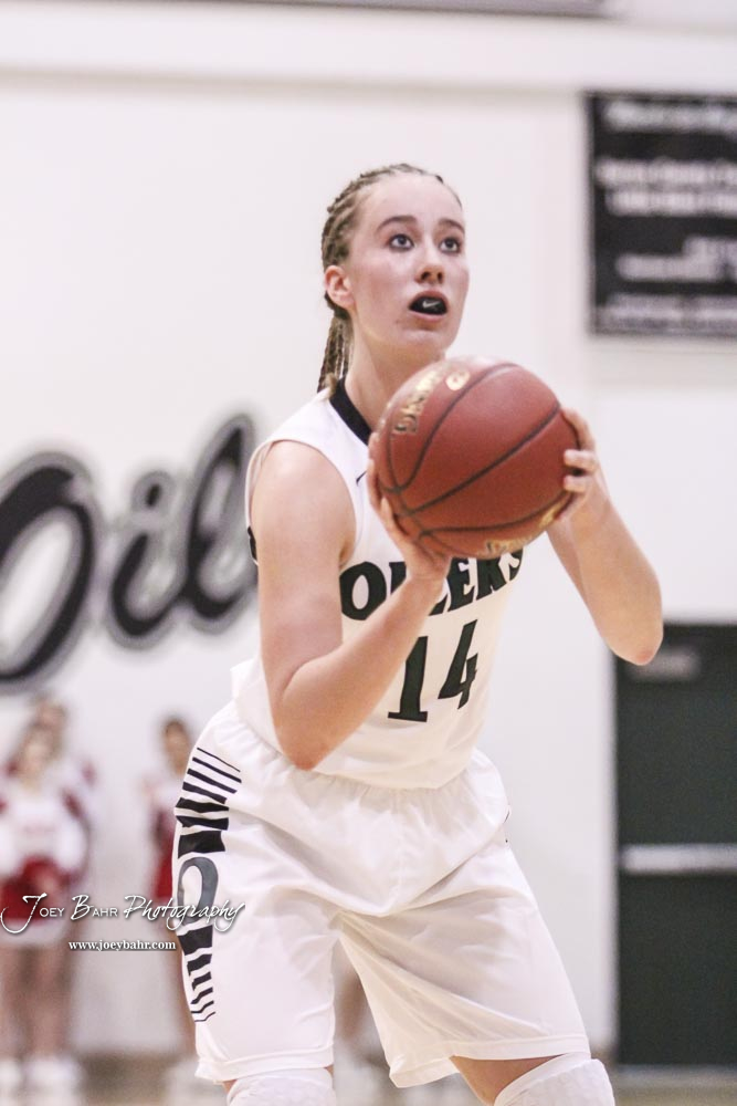 Central Plains Lady Oiler #14 Julie Donecker shoots a free throw attempt. The Central Plains Lady Oilers defeated Hoisington Lady Cardinals by a score of 88 to 23 in a basketball game held at Central Plains High School in Claflin, Kansas on December 1, 2017. (Photo: Joey Bahr, www.joeybahr.com)undefined