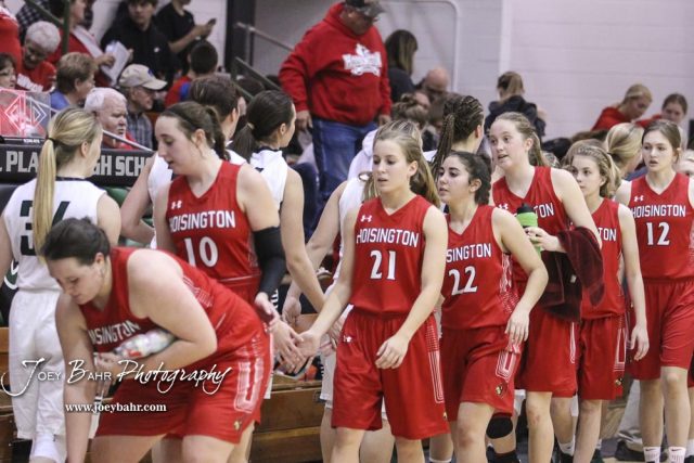 Members of the Central Plains Lady Oilers and Hoisington Lady Cardinals shake hands following the game. The Central Plains Lady Oilers defeated Hoisington Lady Cardinals by a score of 88 to 23 in a basketball game held at Central Plains High School in Claflin, Kansas on December 1, 2017. (Photo: Joey Bahr, www.joeybahr.com)undefined