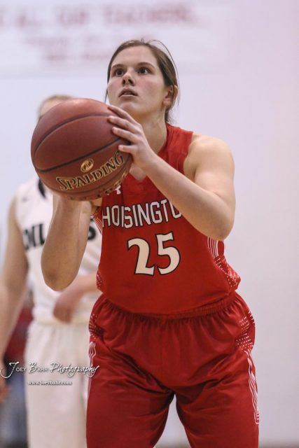 Hoisington Lady Cardinal #25 Maleigha Schmidt shoots a free throw attempt. The Central Plains Lady Oilers defeated Hoisington Lady Cardinals by a score of 88 to 23 in a basketball game held at Central Plains High School in Claflin, Kansas on December 1, 2017. (Photo: Joey Bahr, www.joeybahr.com)undefined