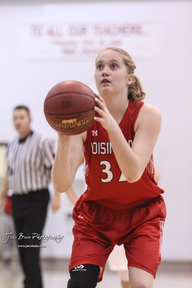 Hoisington Lady Cardinal #32 Kelsi Dalton shoots a free throw attempt. The Central Plains Lady Oilers defeated Hoisington Lady Cardinals by a score of 88 to 23 in a basketball game held at Central Plains High School in Claflin, Kansas on December 1, 2017. (Photo: Joey Bahr, www.joeybahr.com)undefined