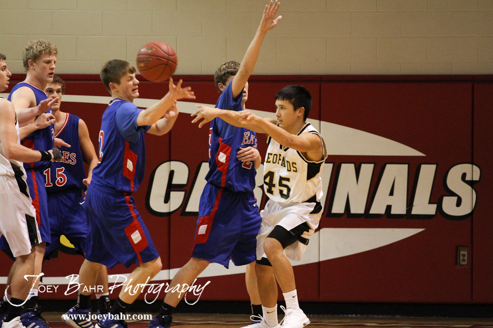 William Storie (#45) of the LaCrosse Leopards passes the ball to a teammate against the Ellinwood Eagles at the 2012 Hoisington Winter Jam Basketball Tournament.