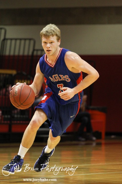 Kale Clawson (#3) of the Ellinwood Eagles takes the basketball down the court against the LaCrosse Leopards at the 2012 Hoisington Winter Jam Basketball Tournament.