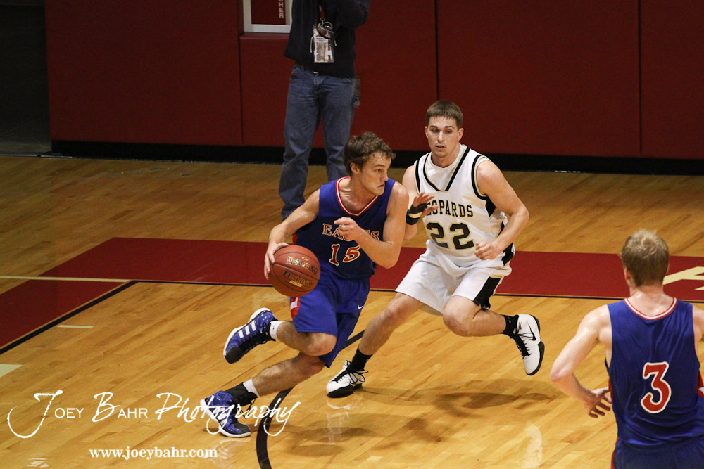 Ellinwood Eagle Kyle Blakeslee (#15) drives past Tayler Stull (#22) of the LaCrosse Leopards at the 2012 Hoisington Winter Jam Basketball Tournament.