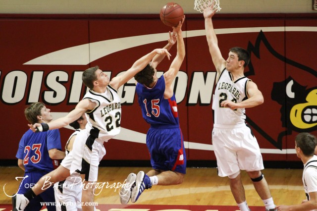 LaCrosse Leopards Tayler Stull (#22) and Kip Keeley (#24) try to block the shot of Ellinwood Eagle Kyle Blakeslee (#15) at the 2012 Hoisington Winter Jam Basketball Tournament.