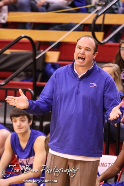 Ellinwood Eagle Head Coach Derek Joiner talks to his players during the 2016 Hoisington Winter Jam Boys Thrid Place Basketball game between the Ellinwood Eagles and the Russell Broncos with Ellinwood winning 47 to 37 of Hoisington Activity Center in Hoisington, Kansas on January 23, 2016. (Photo: Joey Bahr, www.joeybahr.com)undefined