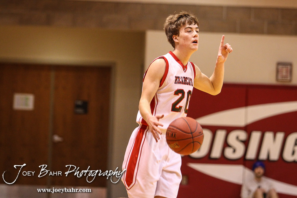 Ellsworth Bearcat Nick Flynn (#20) signals in a play during the 2016 Hoisington Winter Jam First Round Boys Basketball game between the Hoisington Cardinals and the Ellsworth Bearcats with Hoisington winning 57 to 53 of Hoisington Activity Center in Hoisington, Kansas on January 19, 2016. (Photo: Joey Bahr, www.joeybahr.com)undefined