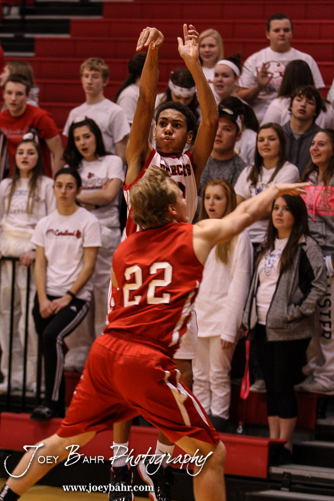 Ellsworth Bearcat Jordan Base (#3) shoots a three point shot as Hoisington Cardinal Grant Dolechek (#22) defends during the 2016 Hoisington Winter Jam First Round Boys Basketball game between the Hoisington Cardinals and the Ellsworth Bearcats with Hoisington winning 57 to 53 of Hoisington Activity Center in Hoisington, Kansas on January 19, 2016. (Photo: Joey Bahr, www.joeybahr.com)undefined