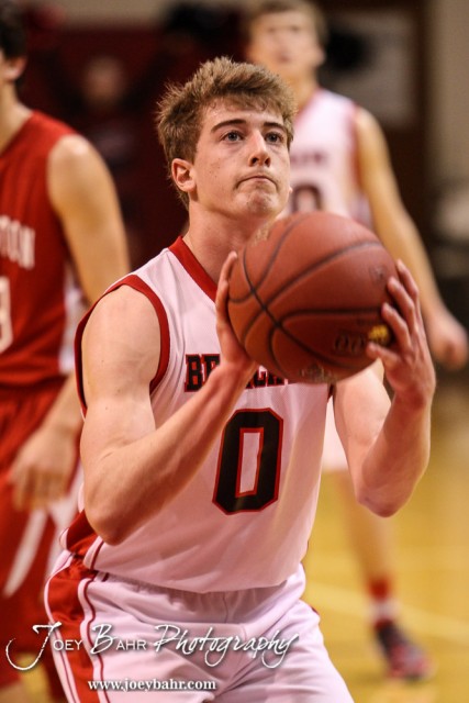Ellsworth Bearcat Kaden Davis (#0) shoots a free throw during the 2016 Hoisington Winter Jam First Round Boys Basketball game between the Hoisington Cardinals and the Ellsworth Bearcats with Hoisington winning 57 to 53 of Hoisington Activity Center in Hoisington, Kansas on January 19, 2016. (Photo: Joey Bahr, www.joeybahr.com)undefined