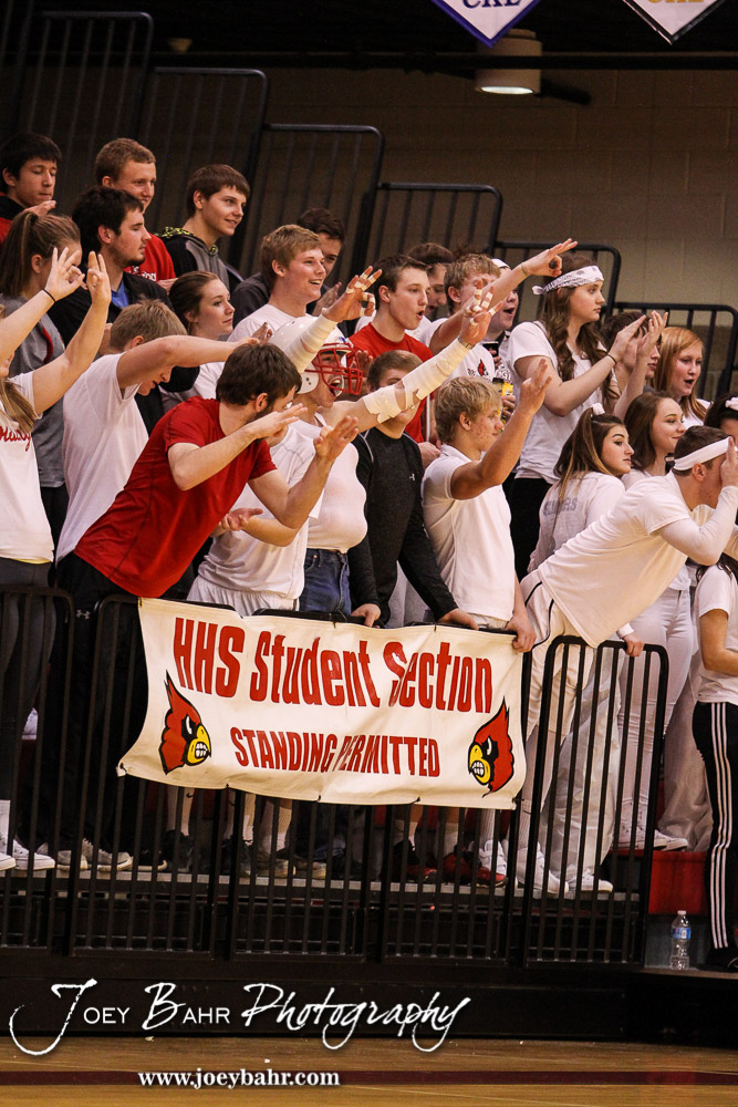 The Hoisington Cardinal Student Section celebrates a made three point shot during the 2016 Hoisington Winter Jam First Round Boys Basketball game between the Hoisington Cardinals and the Ellsworth Bearcats with Hoisington winning 57 to 53 of Hoisington Activity Center in Hoisington, Kansas on January 19, 2016. (Photo: Joey Bahr, www.joeybahr.com)undefined