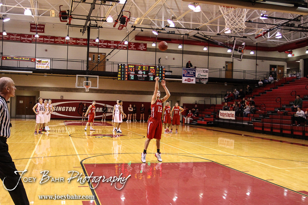 Hoisington Cardinal Steffan Dolechek (#12) shoots a technical free throw during the 2016 Hoisington Winter Jam First Round Boys Basketball game between the Hoisington Cardinals and the Ellsworth Bearcats with Hoisington winning 57 to 53 of Hoisington Activity Center in Hoisington, Kansas on January 19, 2016. (Photo: Joey Bahr, www.joeybahr.com)undefined