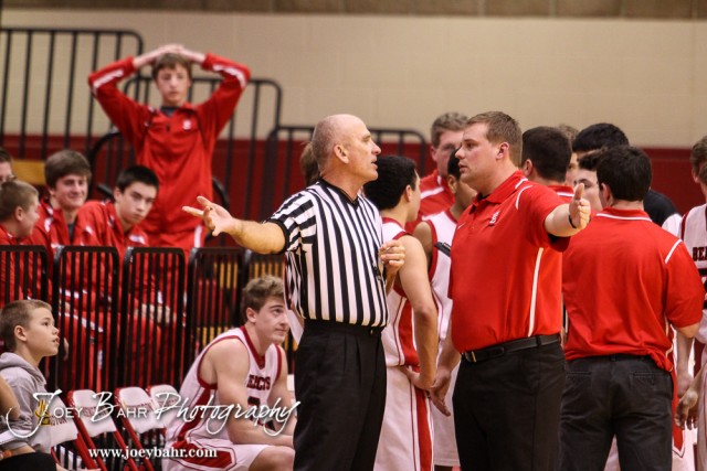 Ellsworth Bearcat Head Coach Trevor Kuhlman discusses a call with a referee during the 2016 Hoisington Winter Jam First Round Boys Basketball game between the Hoisington Cardinals and the Ellsworth Bearcats with Hoisington winning 57 to 53 of Hoisington Activity Center in Hoisington, Kansas on January 19, 2016. (Photo: Joey Bahr, www.joeybahr.com)undefined