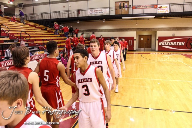 Members of the Hoisington Cardinals and Ellsworth Bearcats shake hands following the 2016 Hoisington Winter Jam First Round Boys Basketball game between the Hoisington Cardinals and the Ellsworth Bearcats with Hoisington winning 57 to 53 of Hoisington Activity Center in Hoisington, Kansas on January 19, 2016. (Photo: Joey Bahr, www.joeybahr.com)undefined