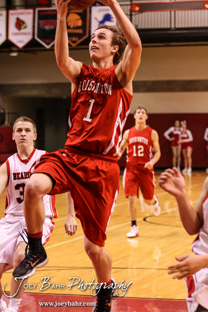Hoisington Cardinal Brenner Donovan (#1) drives the lane for a layup during the 2016 Hoisington Winter Jam First Round Boys Basketball game between the Hoisington Cardinals and the Ellsworth Bearcats with Hoisington winning 57 to 53 of Hoisington Activity Center in Hoisington, Kansas on January 19, 2016. (Photo: Joey Bahr, www.joeybahr.com)undefined