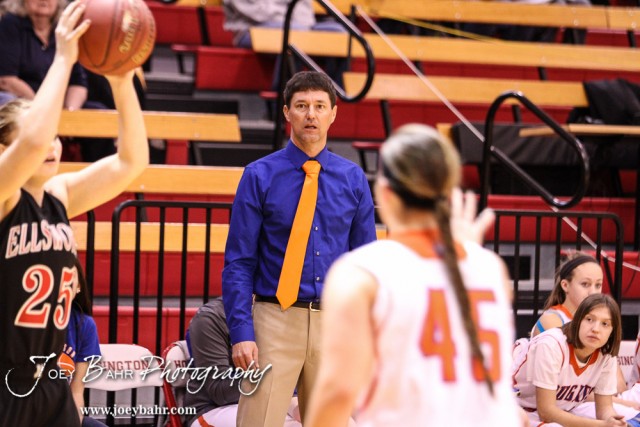 Otis-Bison Lady Cougar Head Coach Robert Trapp watches a play develop during the 2016 Hoisington Winter Jam Girls Fifth Place Basketball game between the Otis-Bison Lady Cougars and the Ellsworth Lady Bearcats with Otis-Bison winning 46 to 40 of Hoisington Activity Center in Hoisington, Kansas on January 23, 2016. (Photo: Joey Bahr, www.joeybahr.com)undefined