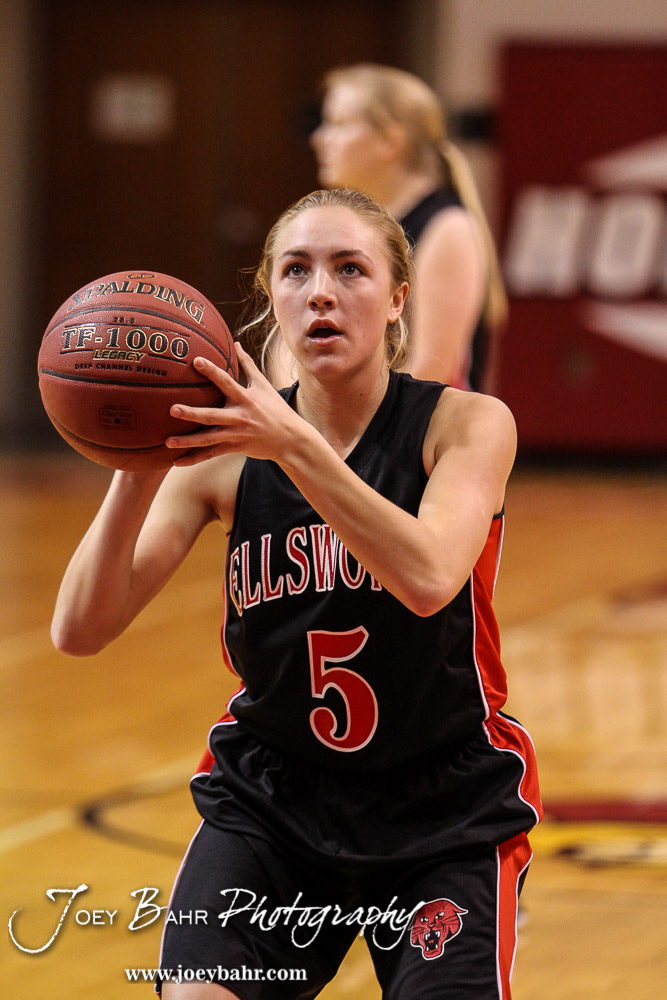 Ellsworth Lady Bearcat Paige Talbott (#5) shoots a free throw during the 2016 Hoisington Winter Jam Girls Fifth Place Basketball game between the Otis-Bison Lady Cougars and the Ellsworth Lady Bearcats with Otis-Bison winning 46 to 40 of Hoisington Activity Center in Hoisington, Kansas on January 23, 2016. (Photo: Joey Bahr, www.joeybahr.com)undefined