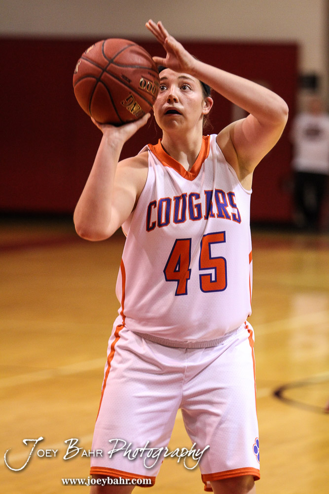 Otis-Bison Lady Cougar Megan Tammen (#45) shoots a free throw during the 2016 Hoisington Winter Jam Girls Fifth Place Basketball game between the Otis-Bison Lady Cougars and the Ellsworth Lady Bearcats with Otis-Bison winning 46 to 40 of Hoisington Activity Center in Hoisington, Kansas on January 23, 2016. (Photo: Joey Bahr, www.joeybahr.com)undefined
