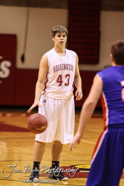 Hoisington Cardinal Ryan Broeder (#43) waits for an open teammate during the 2016 Hoisington Winter Jam Boys Semi-Final Basketball game between the Hoisington Cardinals and the Ellinwood Eagles with Hoisington winning 42 to 39 of Hoisington Activity Center in Hoisington, Kansas on January 22, 2016. (Photo: Joey Bahr, www.joeybahr.com)undefined