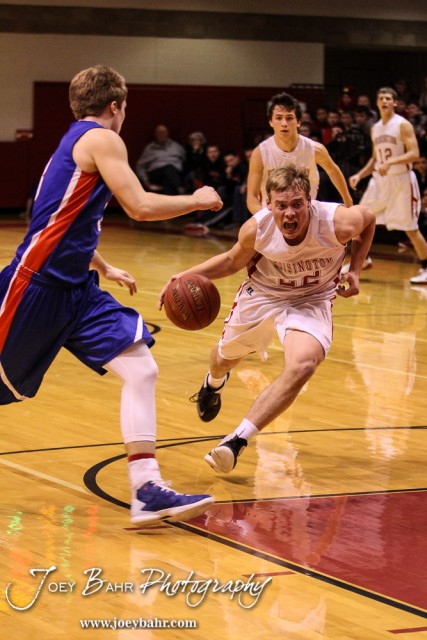 Hoisington Cardinal Grant Dolechek (#22) crashes the lane during the 2016 Hoisington Winter Jam Boys Semi-Final Basketball game between the Hoisington Cardinals and the Ellinwood Eagles with Hoisington winning 42 to 39 of Hoisington Activity Center in Hoisington, Kansas on January 22, 2016. (Photo: Joey Bahr, www.joeybahr.com)undefined