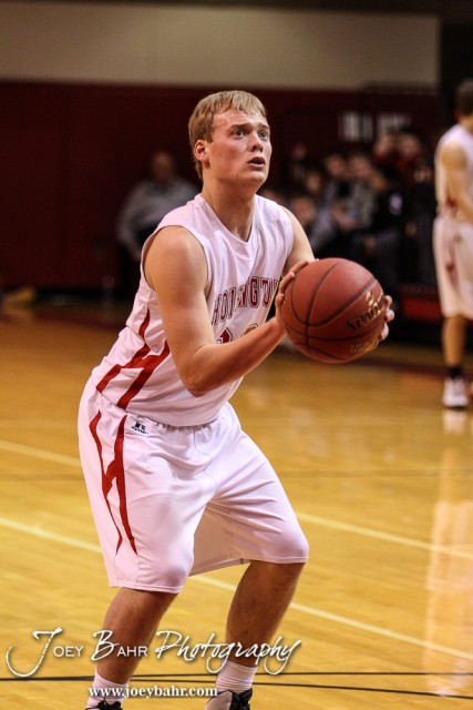 Hoisington Cardinal Grant Dolechek (#22) shoots a free throw during the 2016 Hoisington Winter Jam Boys Semi-Final Basketball game between the Hoisington Cardinals and the Ellinwood Eagles with Hoisington winning 42 to 39 of Hoisington Activity Center in Hoisington, Kansas on January 22, 2016. (Photo: Joey Bahr, www.joeybahr.com)undefined