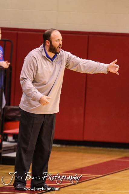 Ellinwood Eagle Head Coach Derek Joiner calls in a play during the 2016 Hoisington Winter Jam Boys Semi-Final Basketball game between the Hoisington Cardinals and the Ellinwood Eagles with Hoisington winning 42 to 39 of Hoisington Activity Center in Hoisington, Kansas on January 22, 2016. (Photo: Joey Bahr, www.joeybahr.com)undefined
