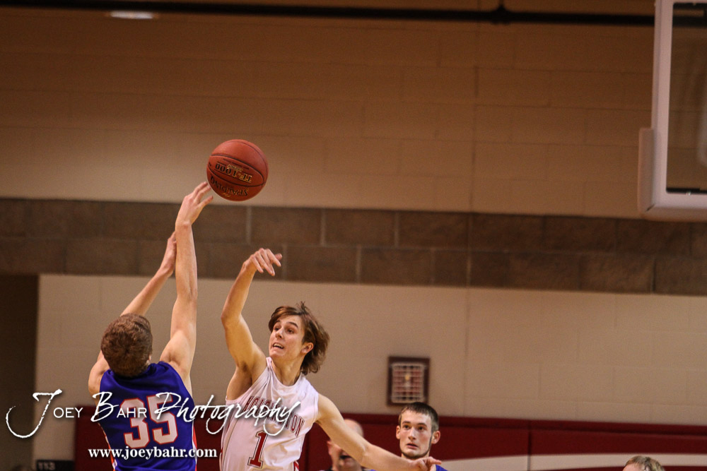 Ellinwood Eagle Nathan Monday (#35) takes a shot as Hoisington Cardinal Brenner Donovan (#1) tries to block it during the 2016 Hoisington Winter Jam Boys Semi-Final Basketball game between the Hoisington Cardinals and the Ellinwood Eagles with Hoisington winning 42 to 39 of Hoisington Activity Center in Hoisington, Kansas on January 22, 2016. (Photo: Joey Bahr, www.joeybahr.com)undefined