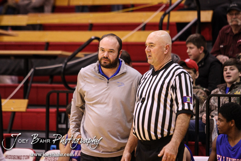 Ellinwood Eagle Head Coach Derek Joiner and Referee Mark Brock discuss a call during the 2016 Hoisington Winter Jam Boys Semi-Final Basketball game between the Hoisington Cardinals and the Ellinwood Eagles with Hoisington winning 42 to 39 of Hoisington Activity Center in Hoisington, Kansas on January 22, 2016. (Photo: Joey Bahr, www.joeybahr.com)undefined