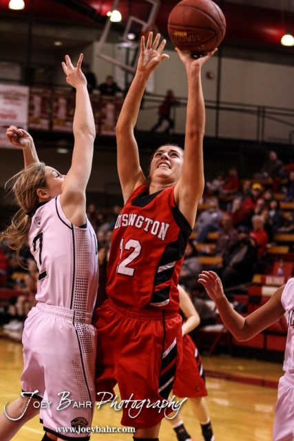 LaCrosse Lady Leopard Emma Rues (#2) tries to defend as Hoisington Lady Cardinal Rylie Koester (#12) takes a shot during the 2016 Hoisington Winter Jam Girls Semi-Final Basketball game between the LaCrosse Lady Leopards and the Hoisington Lady Cardinals with LaCrosse winning 42 to 39 of Hoisington Activity Center in Hoisington, Kansas on January 22, 2016. (Photo: Joey Bahr, www.joeybahr.com)undefined