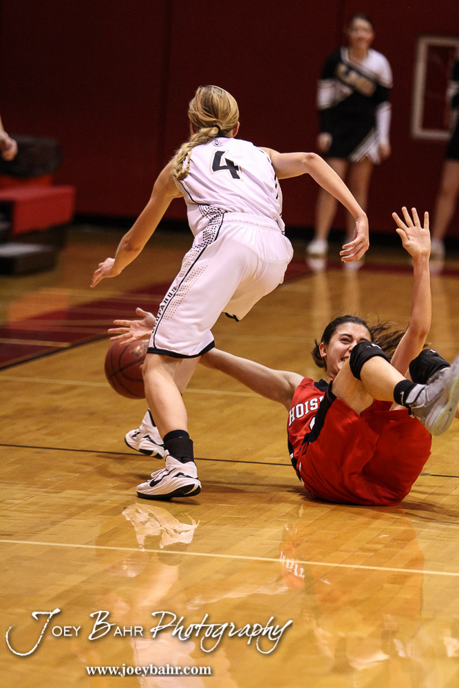 Hoisington Lady Cardinal Rylie Koester (#12) tries to knock away the ball after LaCrosse Lady Leopard Erica Gilbert (#4) stole it during the 2016 Hoisington Winter Jam Girls Semi-Final Basketball game between the LaCrosse Lady Leopards and the Hoisington Lady Cardinals with LaCrosse winning 42 to 39 of Hoisington Activity Center in Hoisington, Kansas on January 22, 2016. (Photo: Joey Bahr, www.joeybahr.com)undefined