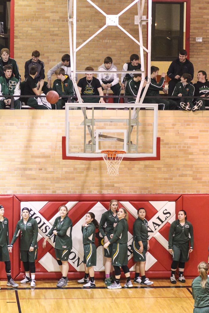 The Pratt Boys Basketball team watches from the stands as the Pratt Lady Greenbacks warmup. The Russell Lady Broncos faced the Pratt Lady Greenbacks in the First Round of the 2018 Hoisington Winter Jam at the Hoisington High School in Hoisington, Kansas on January 16, 2018. (Photo: Joey Bahr, www.joeybahr.com)undefined
