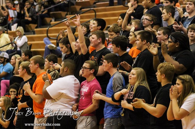 The Larned High School Student Section celebrates a Three-Point basket during the Seventh Annual Keady Basketball Classic First Round game between the Larned Indians and the Kinsley Coyotes with Larned winning 87 to 35 at Larned Middle School in Larned, Kansas on December 8, 2014. (Photo: Joey Bahr, www.joeybahr.com)