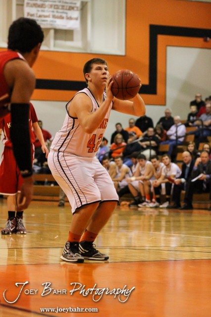 Larned Indians Derek Delgado (#42) shoots a free throw attempt during the Seventh Annual Keady Basketball Classic First Round game between the Larned Indians and the Kinsley Coyotes with Larned winning 87 to 35 at Larned Middle School in Larned, Kansas on December 8, 2014. (Photo: Joey Bahr, www.joeybahr.com)