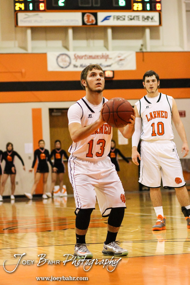 Larned Indians Evan Skelton (#13) prepares to shoot a free throw attempt during the Seventh Annual Keady Basketball Classic First Round game between the Larned Indians and the Kinsley Coyotes with Larned winning 87 to 35 at Larned Middle School in Larned, Kansas on December 8, 2014. (Photo: Joey Bahr, www.joeybahr.com)
