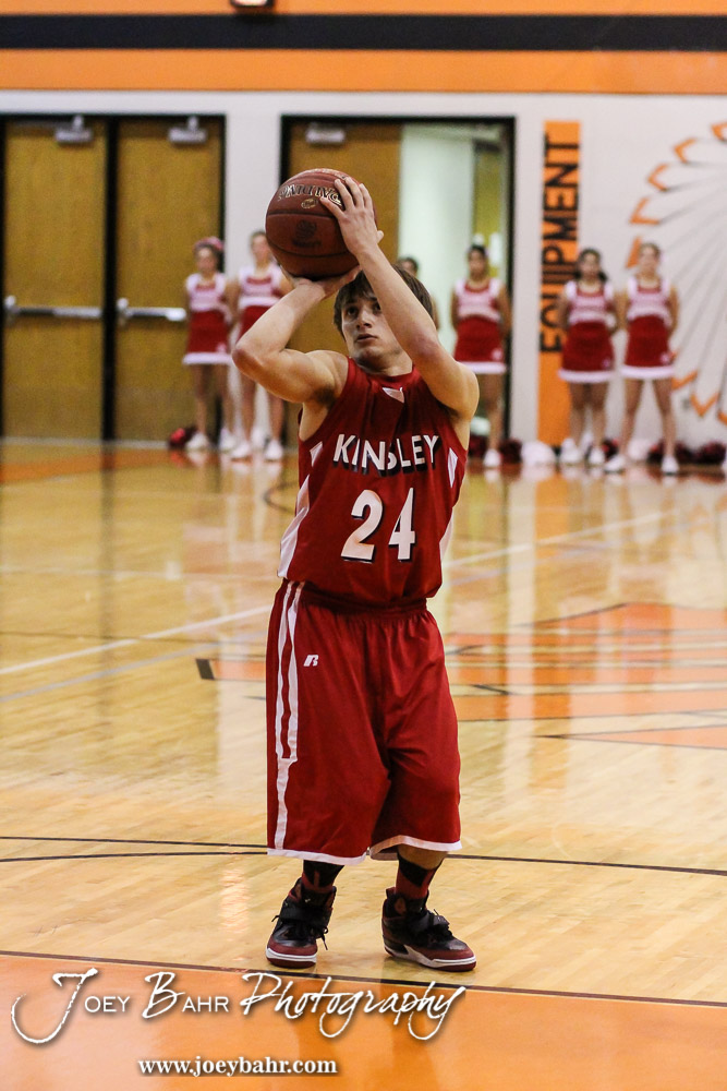 Kinsley Coyote Tyler Espinosa (#24) shoots a free throw attempt during the Seventh Annual Keady Basketball Classic First Round game between the Larned Indians and the Kinsley Coyotes with Larned winning 87 to 35 at Larned Middle School in Larned, Kansas on December 8, 2014. (Photo: Joey Bahr, www.joeybahr.com)