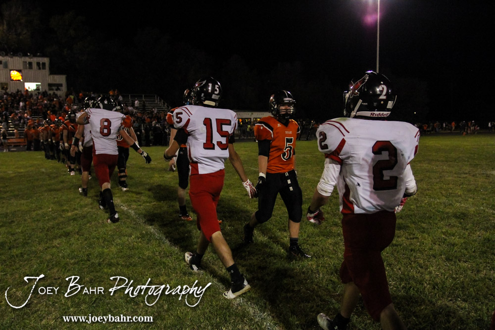 Members of the Kingman Eagles and Larned Indians shake hands following the Kingman Eagles versus Larned Indians High School Football Game with Kingman winning 3 to 0 at Earl Roberts Field at Larned High School near Larned, Kansas on September 19, 2014. (Photo: Joey Bahr, www.joeybahr.com)