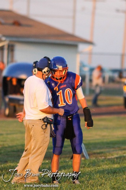 Otis-Bison Cougar Assistant Coach Curtis Little gives the next play to Kade Urban (#10) during the Otis-Bison versus Kinsley High School 8-Man Football Game with Otis-Bison winning 104 to 70 which set a new state record for combined points in a game at Cougar Field at Otis-Bison High School in Otis, Kansas on September 26, 2014. (Photo: Joey Bahr, www.joeybahr.com)