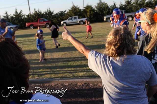 A fan cheers as the Otis-Bison Cougars run to the field before the Otis-Bison versus Kinsley High School 8-Man Football Game with Otis-Bison winning 104 to 70 which set a new state record for combined points in a game at Cougar Field at Otis-Bison High School in Otis, Kansas on September 26, 2014. (Photo: Joey Bahr, www.joeybahr.com)