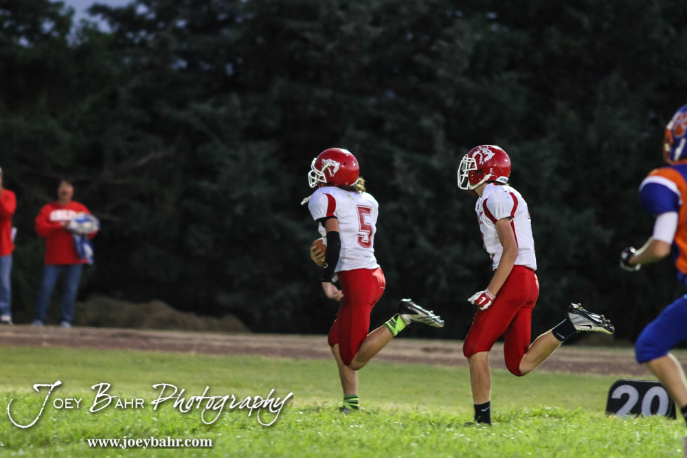 Kinsley Coyote Ross Frame (#5) dashes for the end zone during the Otis-Bison versus Kinsley High School 8-Man Football Game with Otis-Bison winning 104 to 70 which set a new state record for combined points in a game at Cougar Field at Otis-Bison High School in Otis, Kansas on September 26, 2014. (Photo: Joey Bahr, www.joeybahr.com)