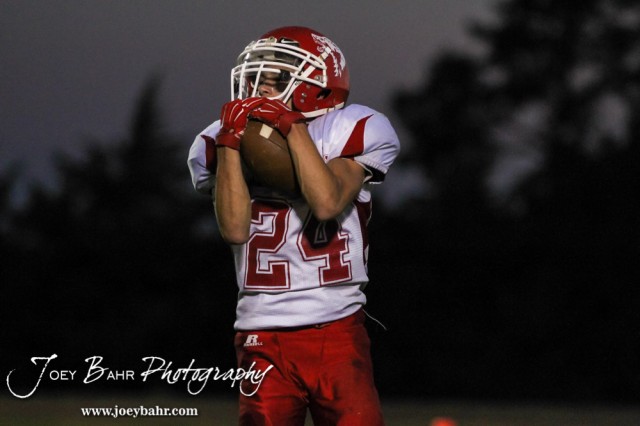 Kinsley Coyote Tyler Espinosa (#24) takes a kickoff during the Otis-Bison versus Kinsley High School 8-Man Football Game with Otis-Bison winning 104 to 70 which set a new state record for combined points in a game at Cougar Field at Otis-Bison High School in Otis, Kansas on September 26, 2014. (Photo: Joey Bahr, www.joeybahr.com)