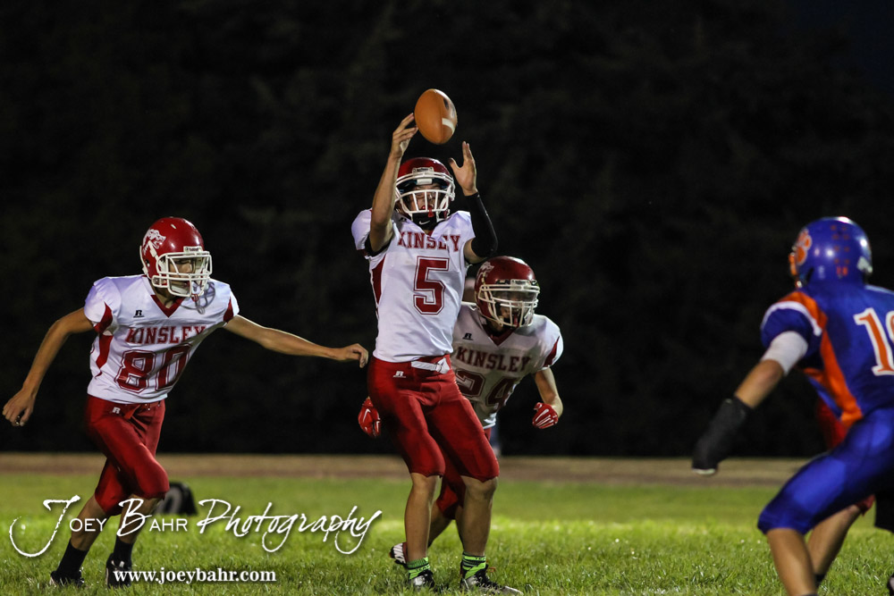 Kinsley Coyote Ross Frame (#5) takes a high snap during the Otis-Bison versus Kinsley High School 8-Man Football Game with Otis-Bison winning 104 to 70 which set a new state record for combined points in a game at Cougar Field at Otis-Bison High School in Otis, Kansas on September 26, 2014. (Photo: Joey Bahr, www.joeybahr.com)