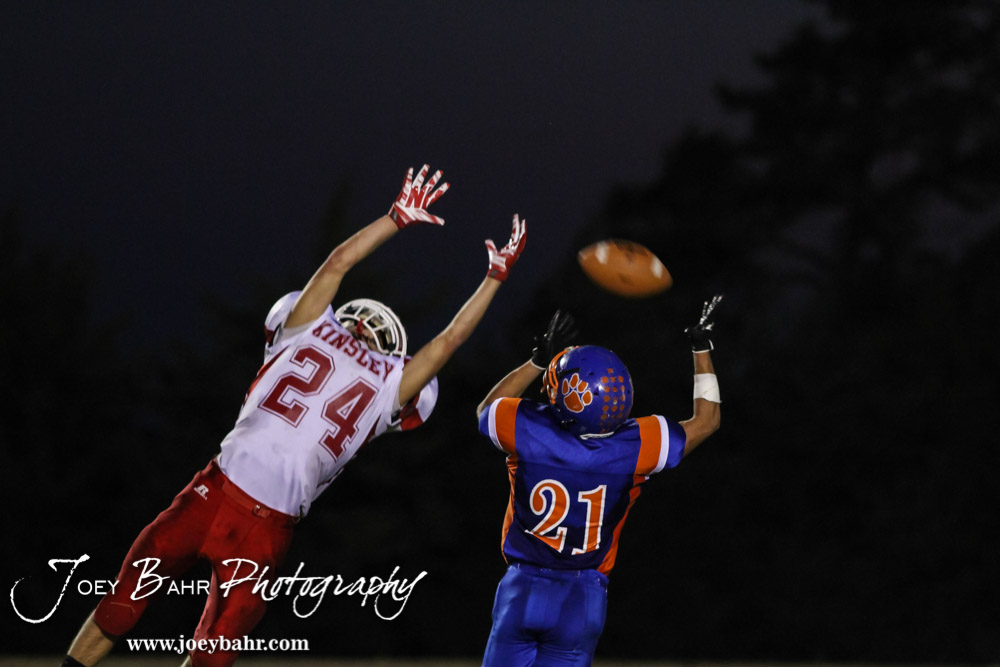 A pass slips through the hands of Kinsley Coyote Tyler Espinosa (#24) while Otis-Bison Cougar Brad Lightfoot (#21) defends during the Otis-Bison versus Kinsley High School 8-Man Football Game with Otis-Bison winning 104 to 70 which set a new state record for combined points in a game at Cougar Field at Otis-Bison High School in Otis, Kansas on September 26, 2014. (Photo: Joey Bahr, www.joeybahr.com)