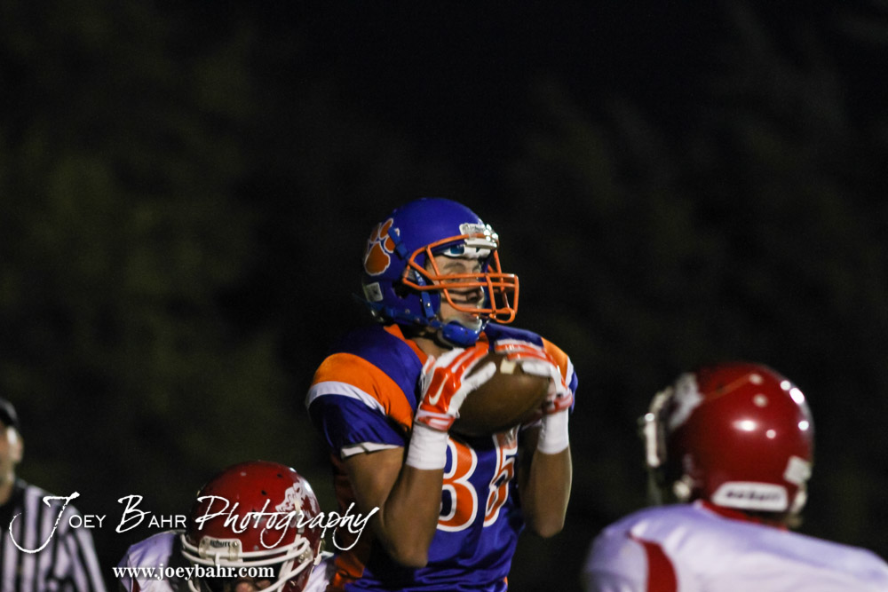Otis-Bison Cougar Kyle Patrick (#35) catches a pass during the Otis-Bison versus Kinsley High School 8-Man Football Game with Otis-Bison winning 104 to 70 which set a new state record for combined points in a game at Cougar Field at Otis-Bison High School in Otis, Kansas on September 26, 2014. (Photo: Joey Bahr, www.joeybahr.com)
