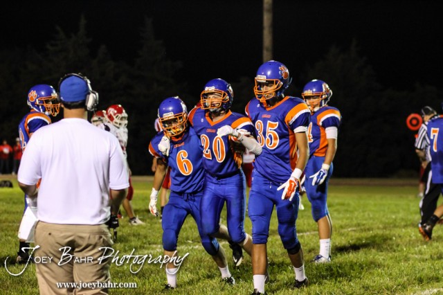 Teammates Dejay Vaughn (#6) and Kyle Patrick (#35) help Otis-Bison Cougar Trenton Welsh (#20) off the field after he was injured during the Otis-Bison versus Kinsley High School 8-Man Football Game with Otis-Bison winning 104 to 70 which set a new state record for combined points in a game at Cougar Field at Otis-Bison High School in Otis, Kansas on September 26, 2014. (Photo: Joey Bahr, www.joeybahr.com)