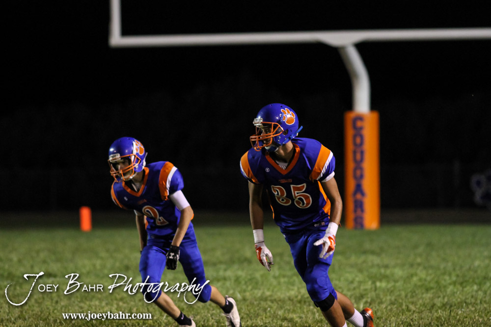 Otis-Bison Cougars Brandon Keller (#2) and Kyle Patrick (#35) start to run a route during the Otis-Bison versus Kinsley High School 8-Man Football Game with Otis-Bison winning 104 to 70 which set a new state record for combined points in a game at Cougar Field at Otis-Bison High School in Otis, Kansas on September 26, 2014. (Photo: Joey Bahr, www.joeybahr.com)
